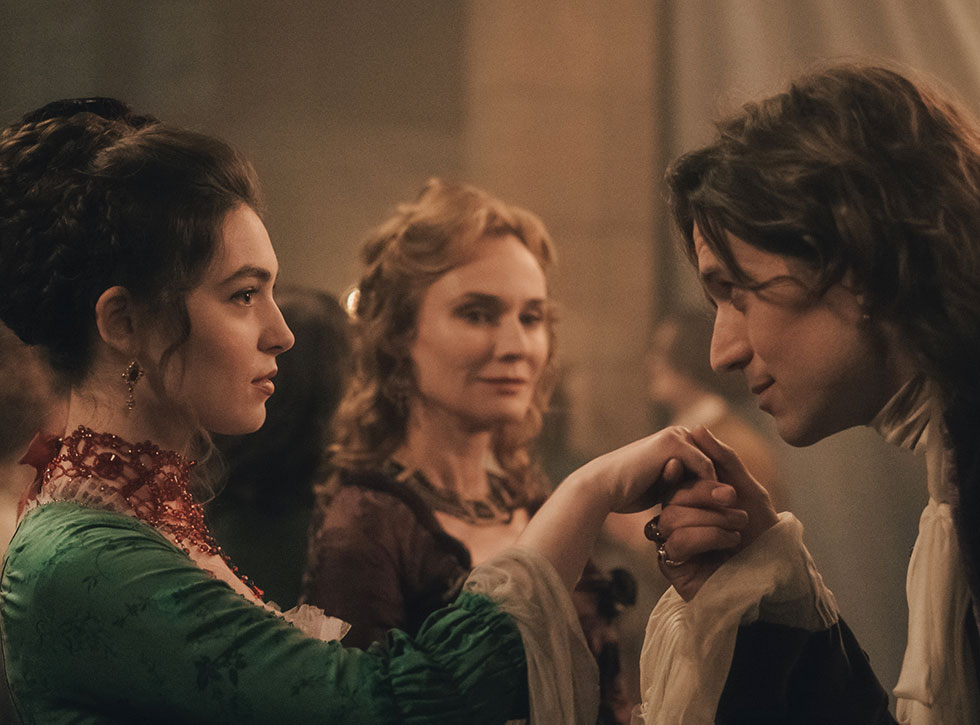 Anamaria Vartolomei i rollen som markisinnan de Merteuil uppvaktad av greve de Gercourt spelad av Lucas Bravo. I bakgrunden Diane Kruger som spelar madame de Rosemonde. Foto: HBO Max