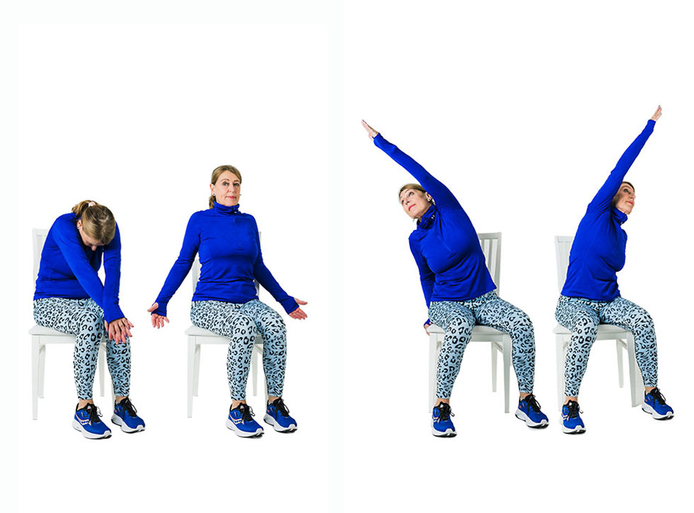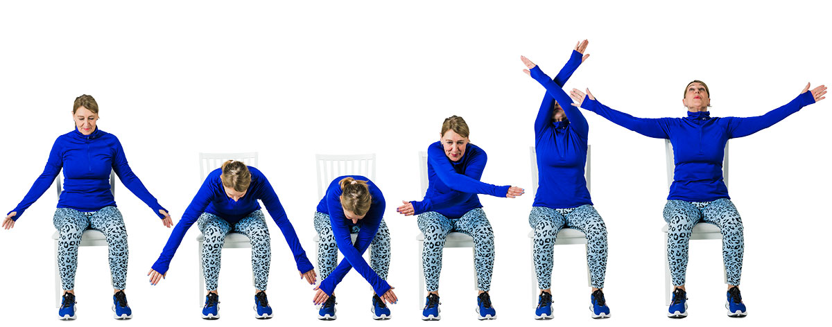 Sitt stadigt på stolen – sänk axlar och slappna av. Gör en stor armcirkel framför kroppen, starta nerifrån framför benen och andas samtidigt in – cirkla upp och andas ut när du kommer ner med armarna. Repetera 5 gånger.