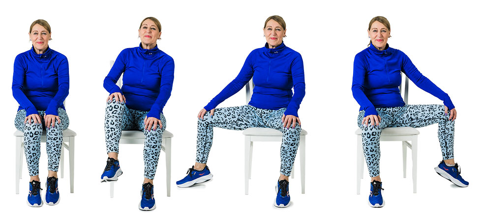 Sitt stadigt på stolen. Lyft upp ett ben – för benet till sidan på inandning – kom tillbaka med benet på utandning. 5 gånger på varje ben.