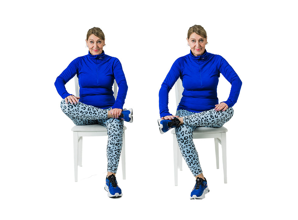 Sitt stadigt på stolen. Lägg upp foten på det andra benet och böj dig lite framåt så att du känner att det drar i sätesmuskeln.