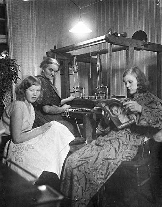 Kvinnorna i familjen Hansson väver, syr och läser i köket år 1932.
