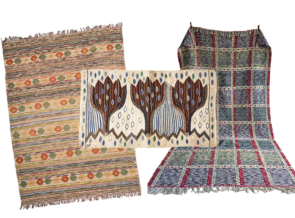 Trasmattornas återkomst. Handvävda favoriter hos allmogen har nu hittat in i finrummen. Foto: Auctionet, Bukowskis, Sikö auktioner, Tradera och Uppsala auktionskammare