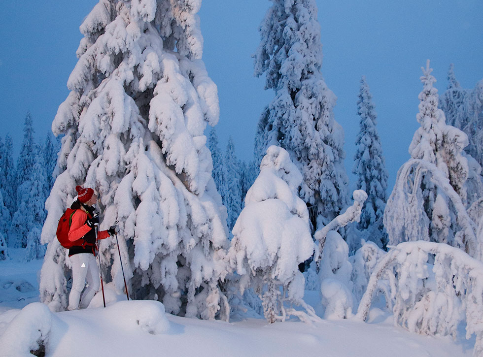 Jag som föredrar längd inleder med ett par timmars glid längs Toppspåret och Bergsspåret, över myrmarker och genom tät granskog. Häftig natur med klar vildmarkskänsla – i synnerhet en dag som denna då snön bäddat in skogen i ett ispansar och där träden hukar under snömassorna. Dessutom känns det skönt att kunna ta gondolen upp till toppen för att börja där och sedan kunna glida tillbaka till Tranantorget.