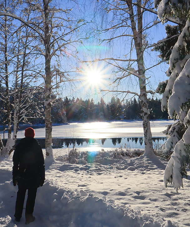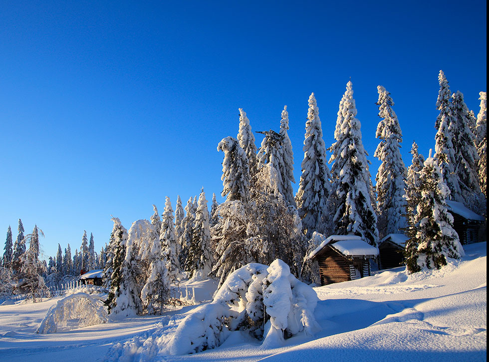Midvintertid i Högbo Bruk, mitt första stopp på den vintriga resan till Dalarna. Det är vykortsvackert, med snötyngd gammelskog och luften skimrande av iskristaller. Molnen varslar om mer kall nederbörd.